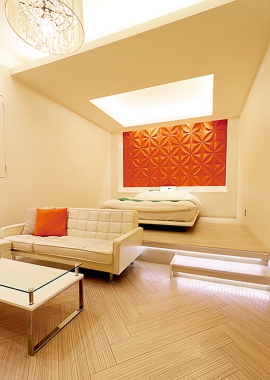 - 207号室は,シンプル&ミニマルなディテールと,自然光のように温かく柔らかいライティング,アクセントに使われているオレンジカラーとグリーン×ホワイトポップな色使い,カリモク60とLC3をかけ合わせたようなソファーの組み合わせで,「ミッドセンチュリーモダン」なテイストに仕上げました。
